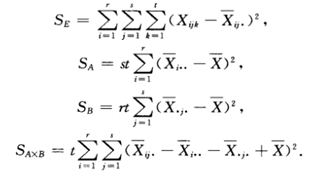 SSA、SSB(因素AB的效应平方和)、SSAB(AB交互效应平方和)