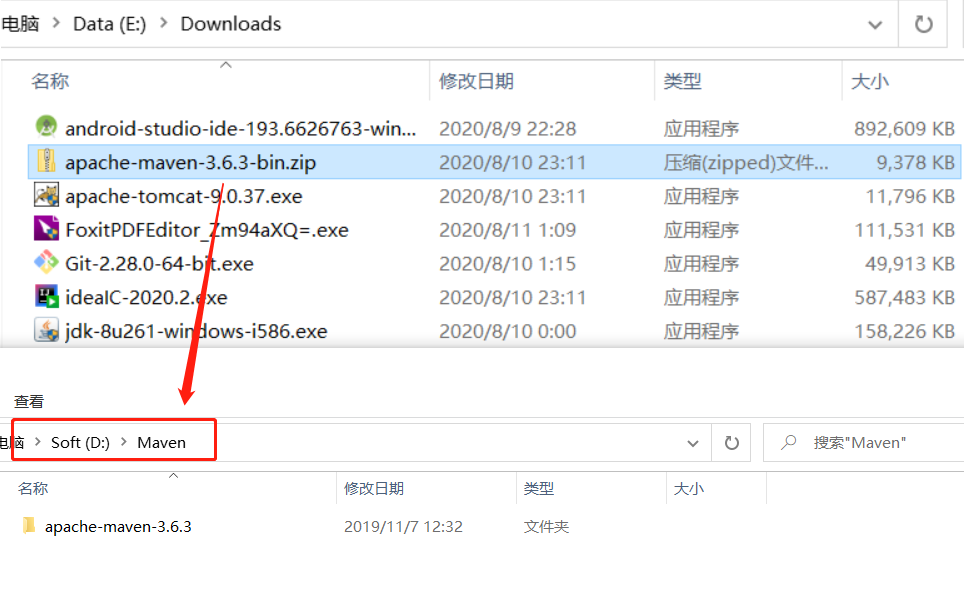 通过上面说的系统要求,基本上就不用再考虑版本问题了,直接选择最新版本安装就是了,当前最新版本是 2019-11-25 发布的 apache-maven-3.6.3;官网只给出了压缩包安装(类似绿色版,解压即可用)和 源码压缩包(可以用于自己构建Maven),对于小白的我们,选择前者即可。