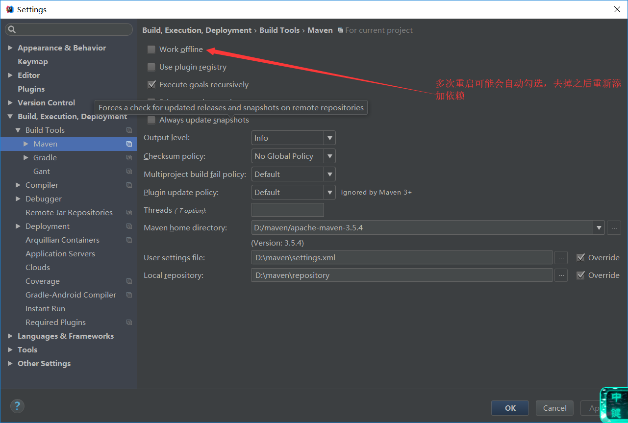 setting》》maven》》去掉work offline 的勾。(这里肯定是去掉勾的)