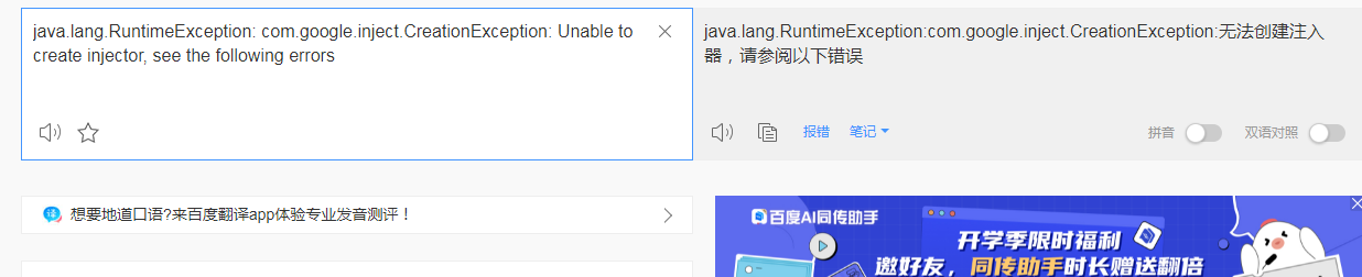 翻译了下,大致是这样:没办法创建注入器。