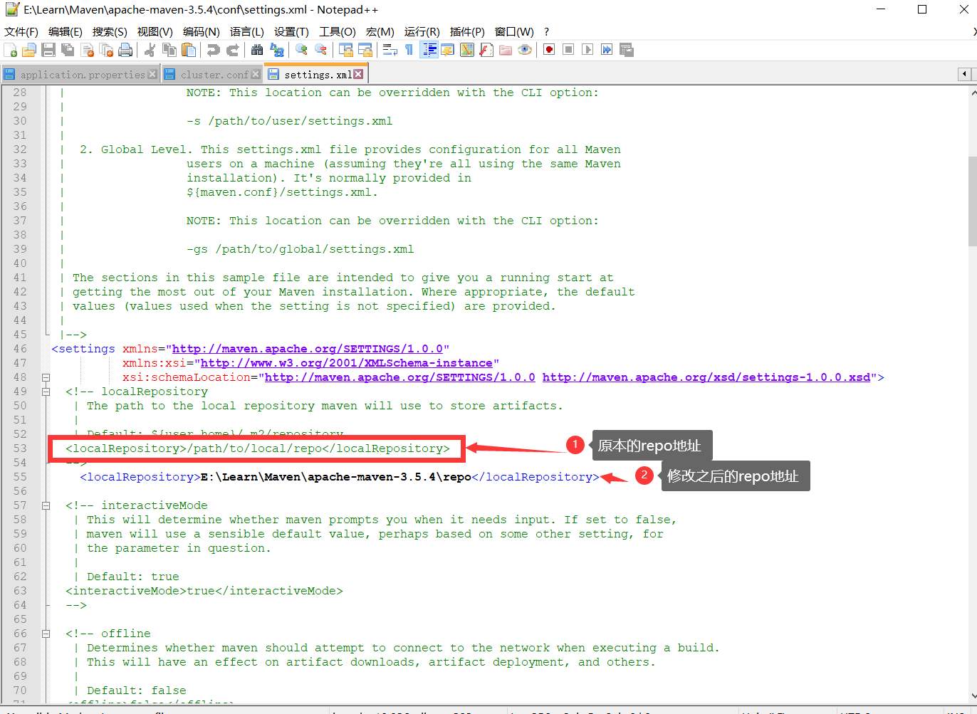 2、找到第55行,这里是maven默认的仓库(在解压的路径下面去添加一个空的repo文件)