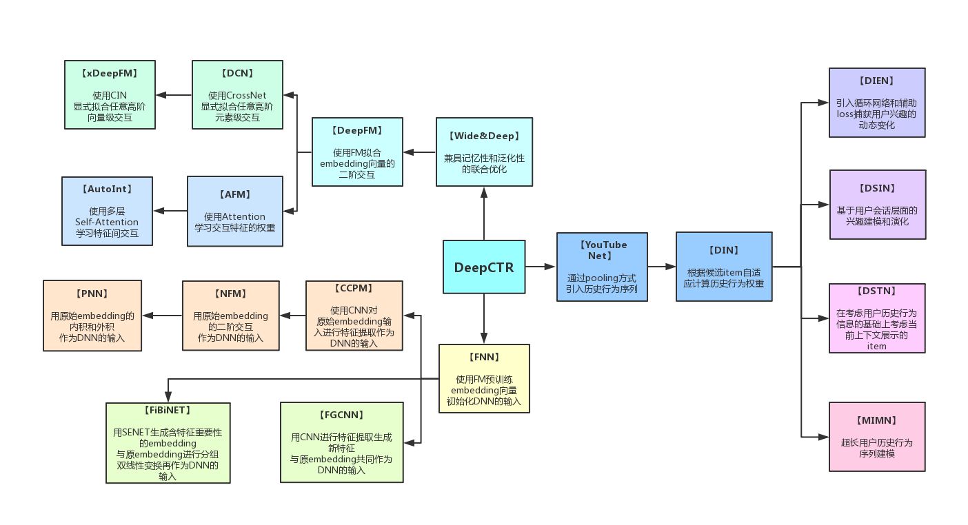这个项目主要是对目前的一些基于深度学习的点击率预测算法进行了实现,如PNN,WDL,DeepFM,MLR,DeepCross,AFM,NFM,DIN,DIEN,xDeepFM,AutoInt等,并且对外提供了一致的调用接口。 关于每种算法的介绍这里就不细说了,大家可以看论文,看知乎,看博客,讲的都很清楚。