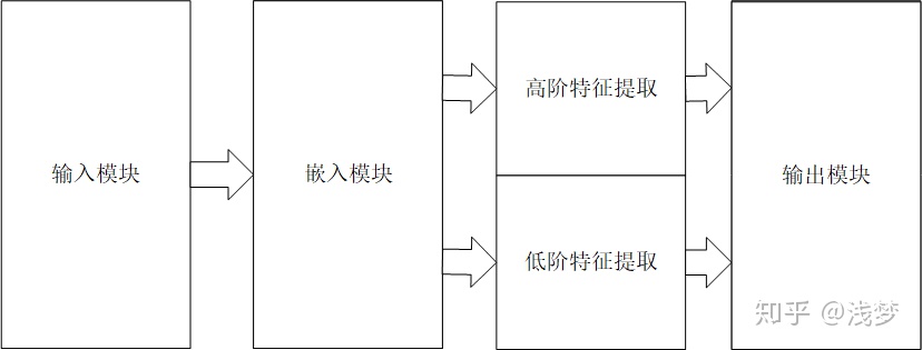 DeepCTR通过对现有的基于深度学习的点击率预测模型的结构进行抽象总结,在设计过程中采用模块化的思路,各个模块自身具有高复用性,各个模块之间互相独立。 基于深度学习的点击率预测模型按模型内部组件的功能可以划分成以下4个模块:输入模块,嵌入模块,特征提取模块,预测输出模块。