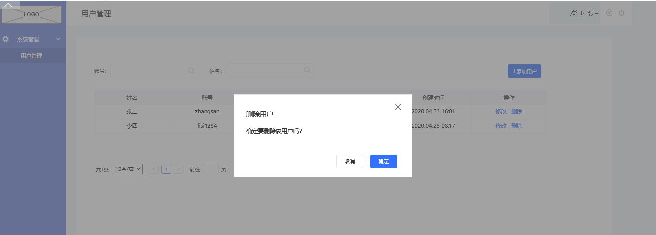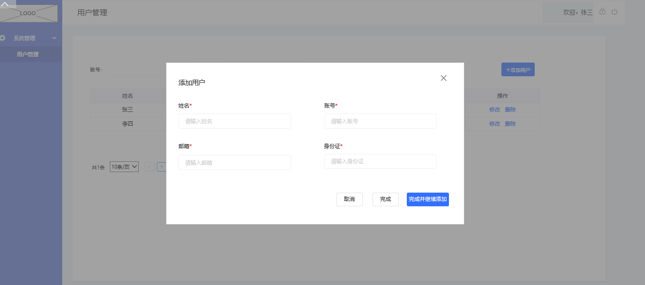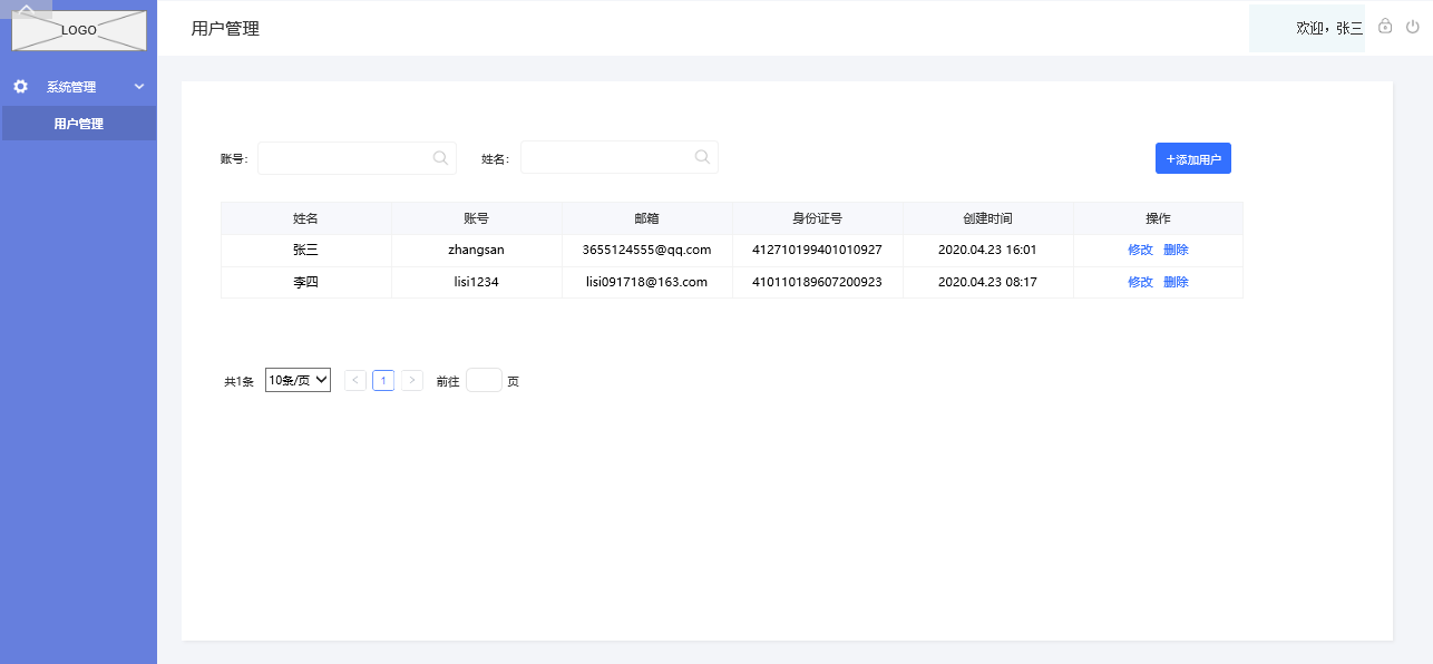 2.登录后的首页,上方有个单色区域,右上角有修改密码和退出。左边是菜单,根菜单为系统管理,系统管理下方有用户管理。右边默认就是用户管理的列表,组合查询条件为账号和姓名,列表显示列为姓名,账号,邮箱,身份证号,创建时间,功能有新增/修改/删除/查看。