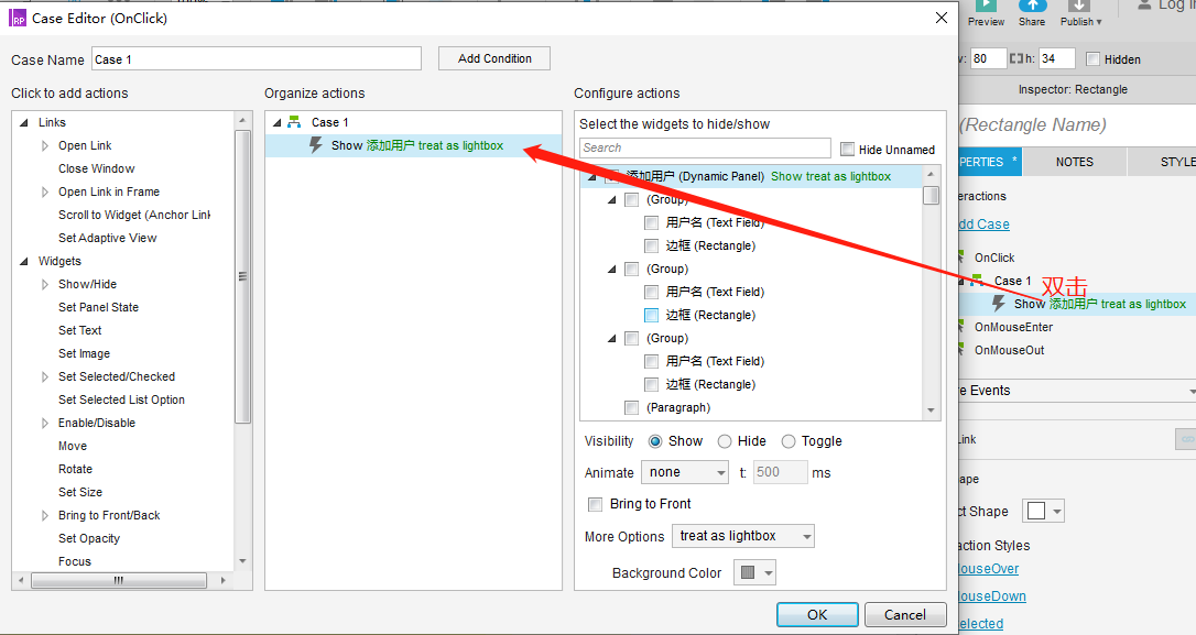 拖入一个矩形框,设置该矩形框的名称为【用户名-背景】,并且设置该矩形框的获取焦点以后的颜色是红色;拖入一个文本框,设置该文本框的名称为【用户名】,并且设置该文本框的边框隐藏。