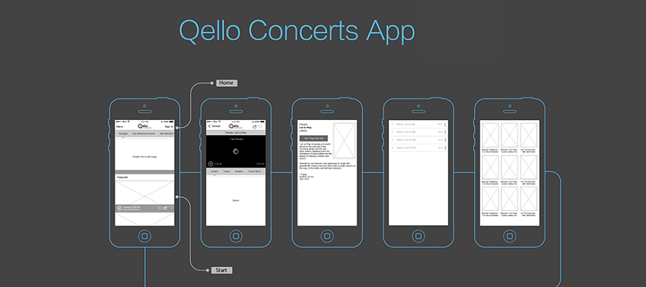 Qello Concerts是一个独特的音乐应用APP线框图示例。该APP包括了首页,热点页面,顶尖音乐会推荐页面,新歌发布页面,浏览页面等主要界面。该例子通过使用弹出面板,滑动抽屉和其他封装好的组件,通过鼠标拖拽可以快速完成交互。
