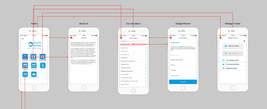 这是一个提供会计和商业咨询服务的应用程序。布局清晰简洁,主菜单由图标和字符组成。在Mockplus中,只需使用带图标按钮组件即可完成,它可以同时编辑图标和文本。