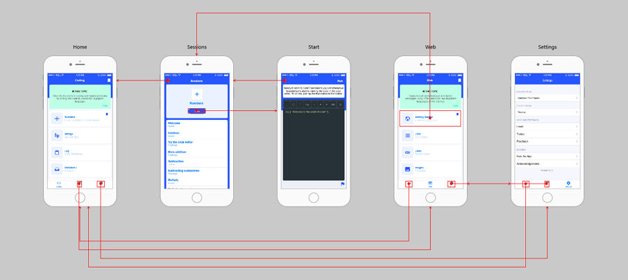 Encode是一个用于学习编程的教育应用程序。这个应用程序的颜色是系统预设的,布局简单明了。首页包含了大量的列表,可以使用Mockplus中的Repeater组件快速制作。此外,该页面是一个很长的页面,用户需要滚动屏幕来查看更多的信息,这可以通过两种方式实现:一是Mockplus页面上的小红色滑块,二是滚动区组件。