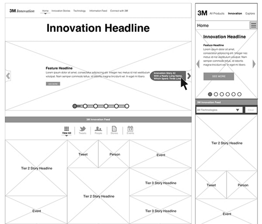 此网站原型图例子是一个附加到3M.com的线框图整合,并且是可响应式的设计。该线框图呈现了全球物理创新中心的数字家园,并重点介绍了允许3M创新推动人类发展和潜力发掘的新技术。