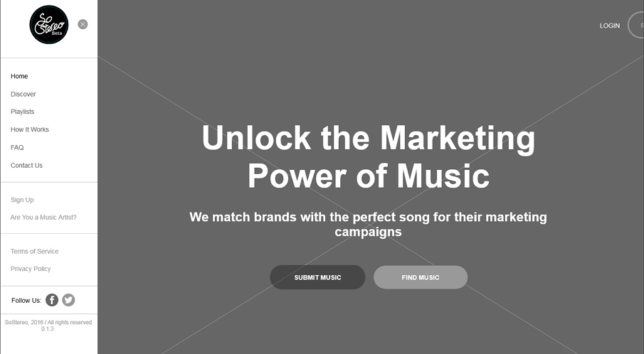 该例子是一个简单却有趣的音乐类线框图例子。其主要页面包含主页,搜索,发现,常见问题,隐私政策,服务条款等。最贴心和吸引人的部分是你可以提交你喜欢的音乐,只需点击主页的“提交音乐”按钮即可。