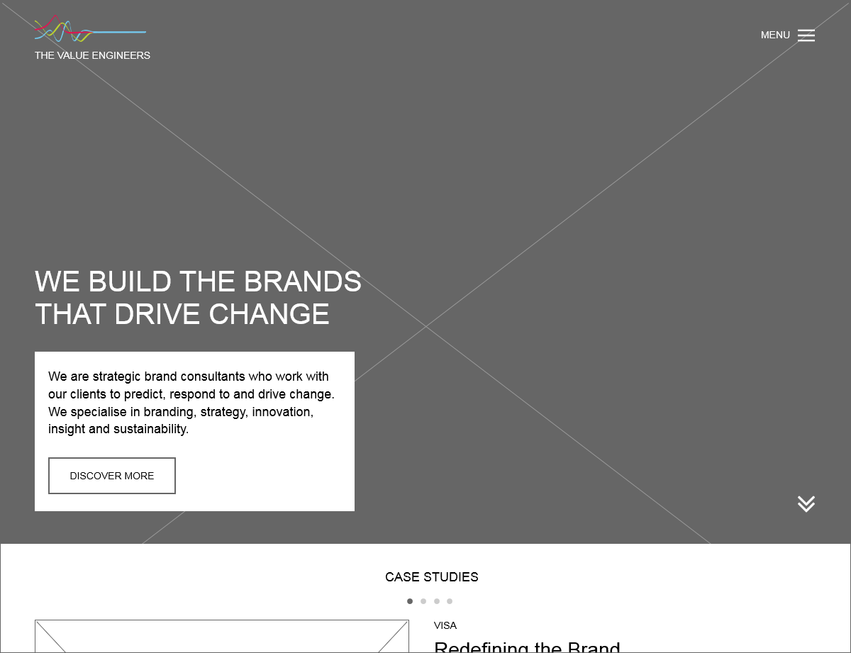 该例子是一个战略品牌顾问网站,它的突出特色在于其在品牌,战略和创新方面拥有一定的专业知识和洞察力。此线框图示例的主要页面包括主页,关于我们,与我们合作的人员,联系人,详细信息等界面。