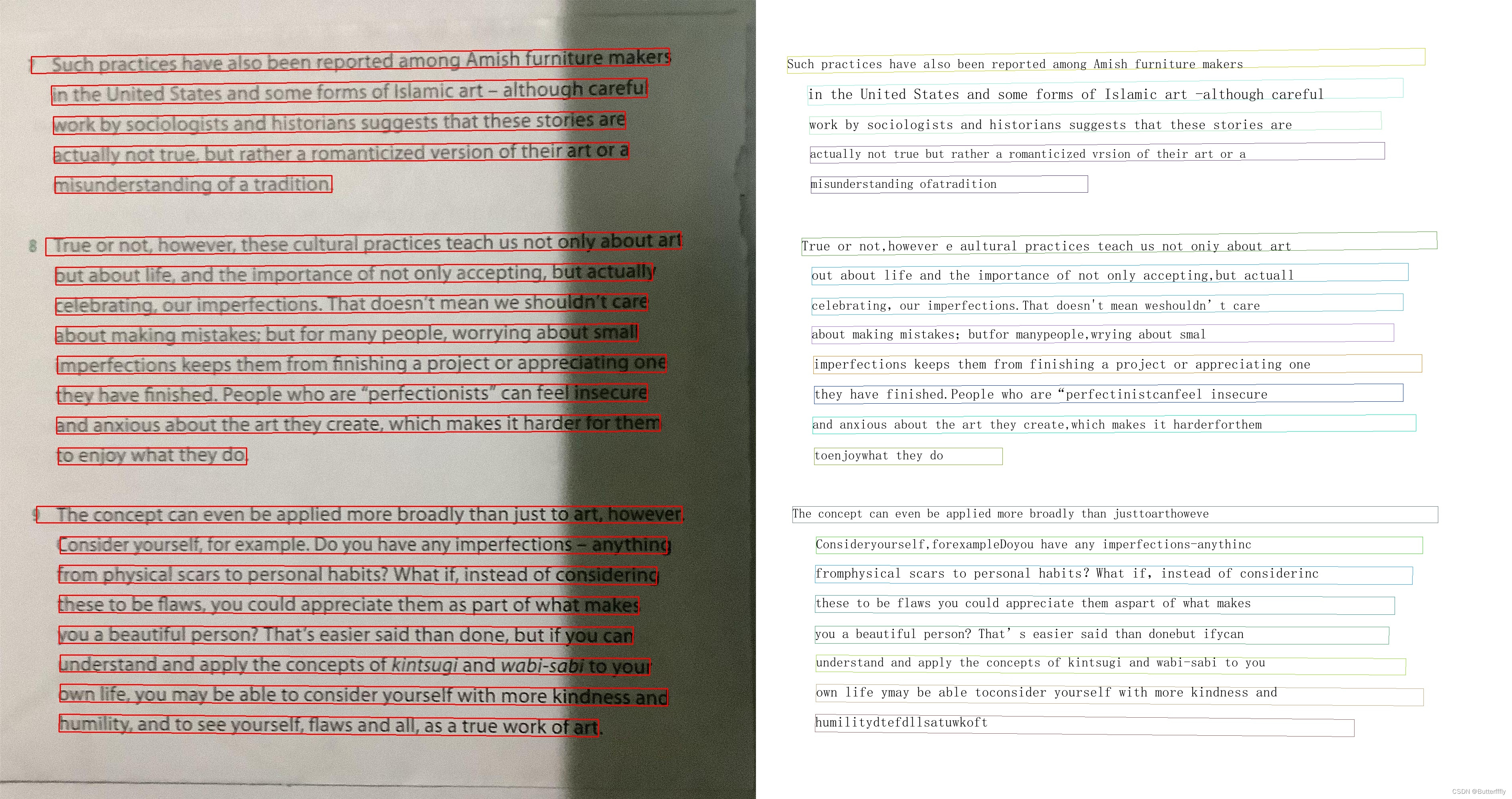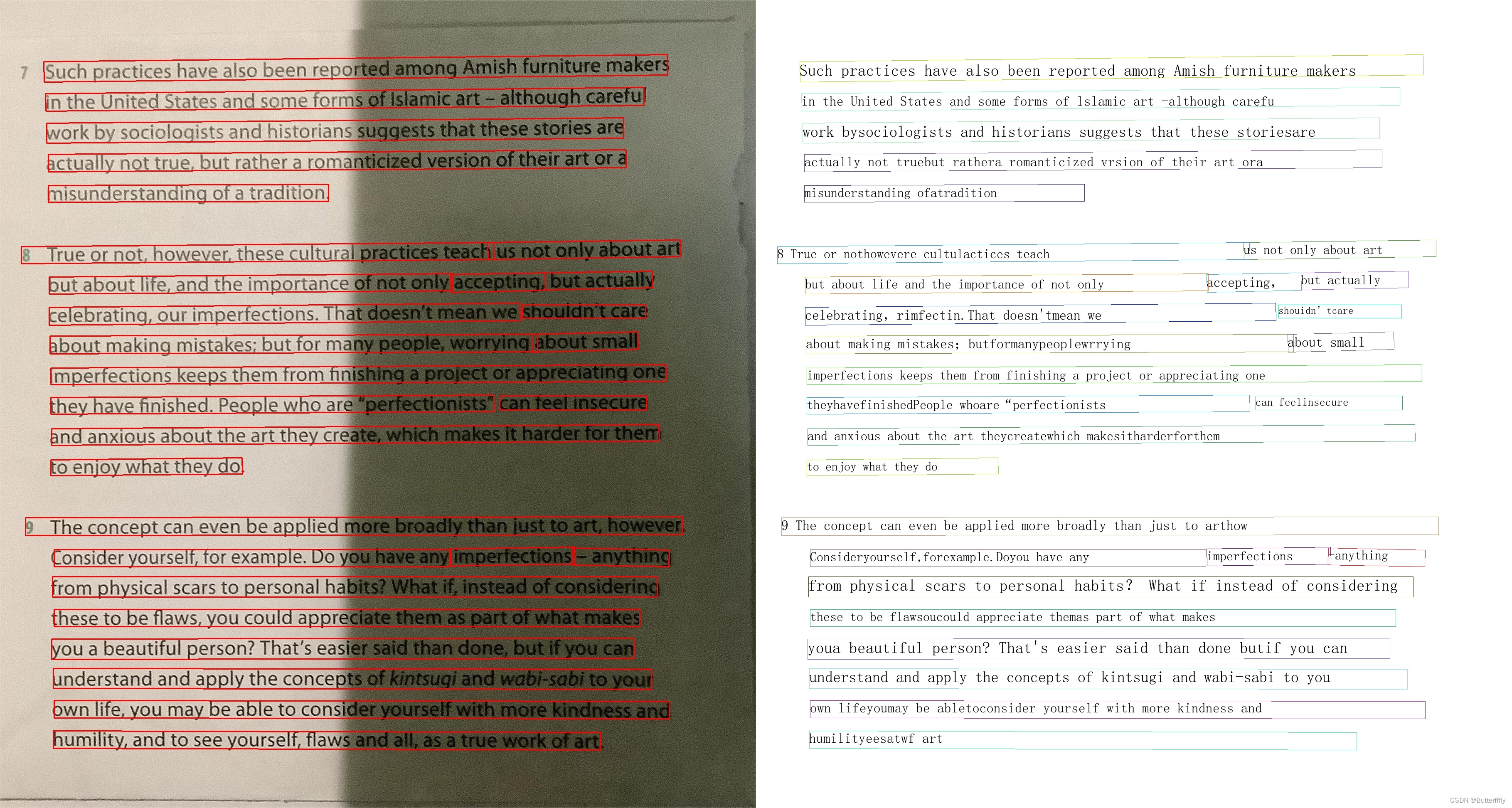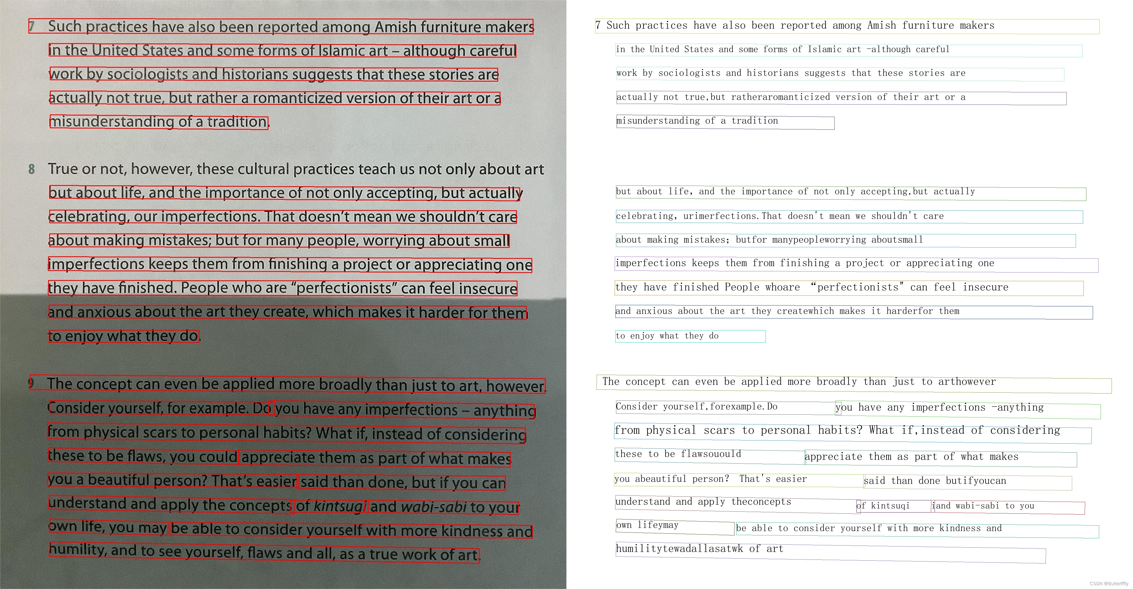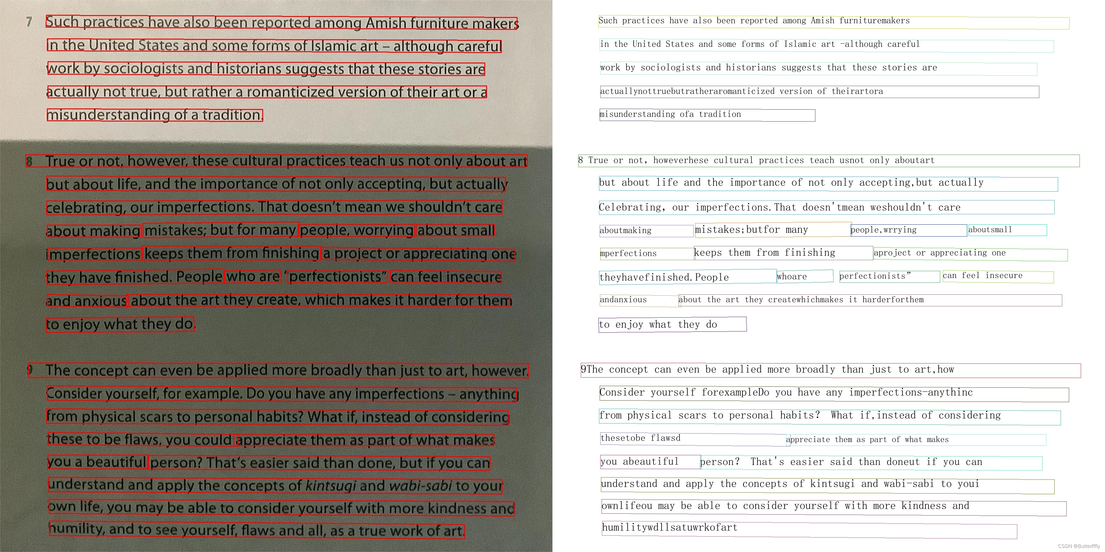1)无阴影时,可以检测一整行为一个文本框;在阴影覆盖区域,一行文字会被识别为多个文本框。