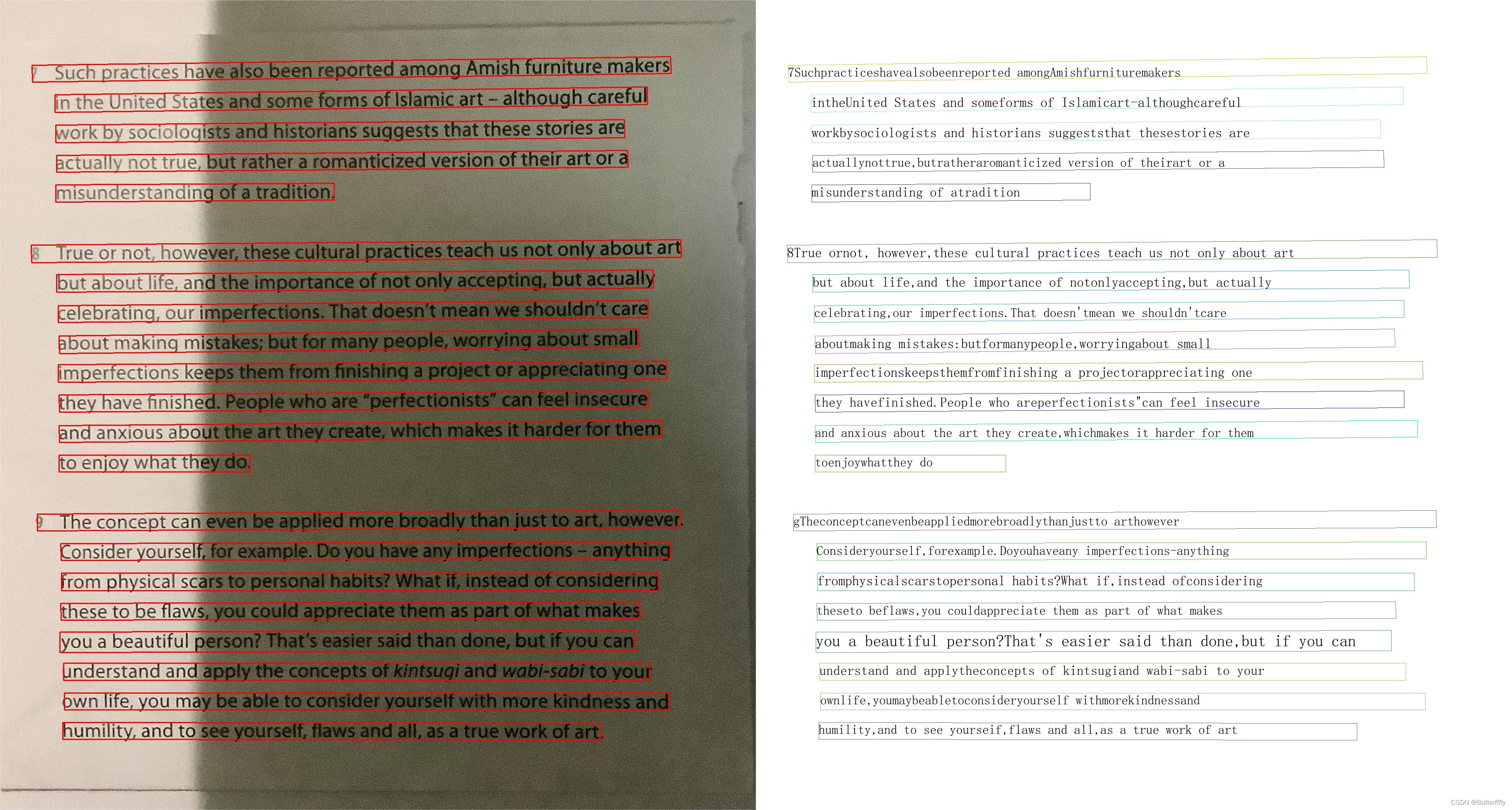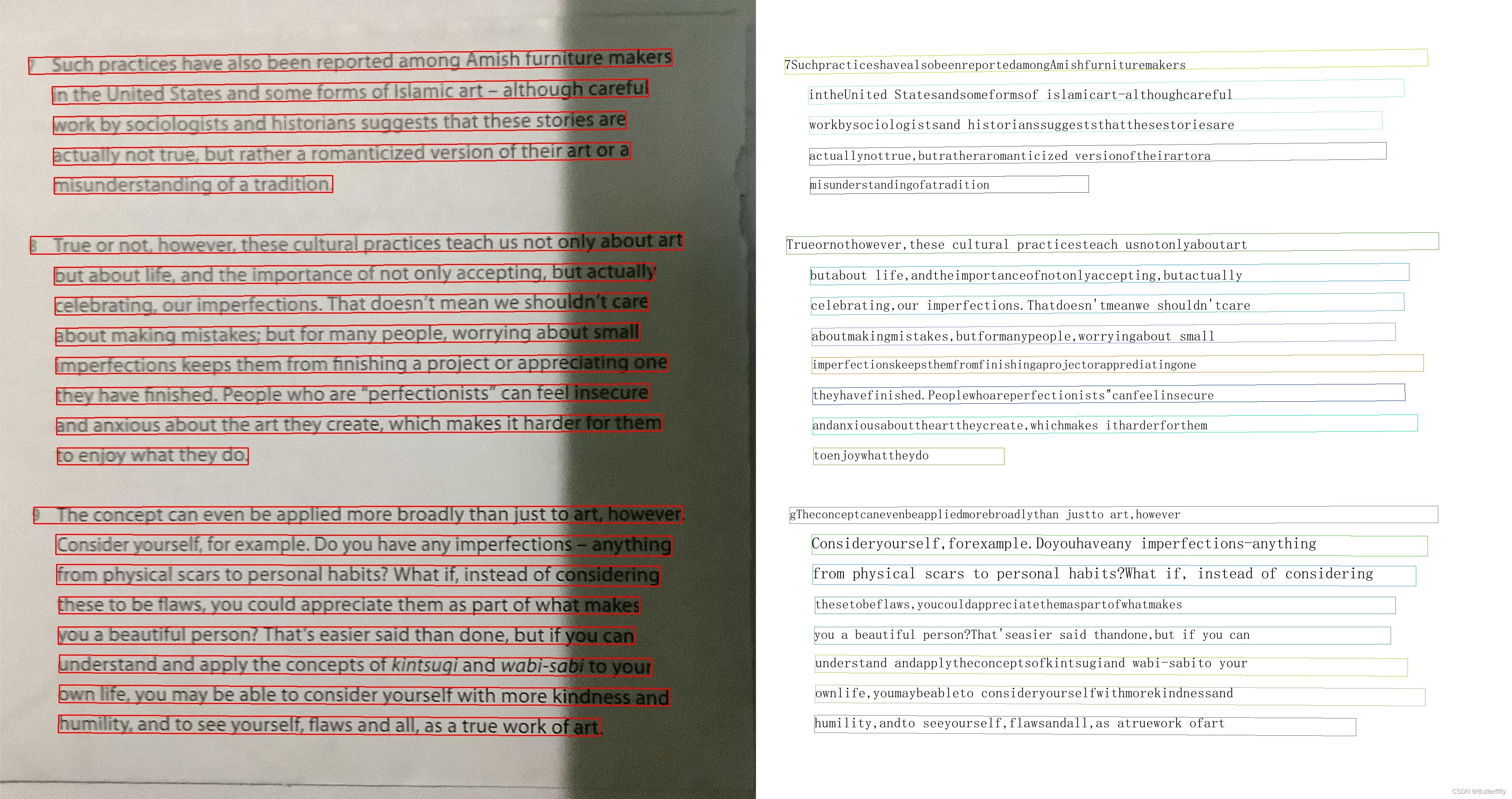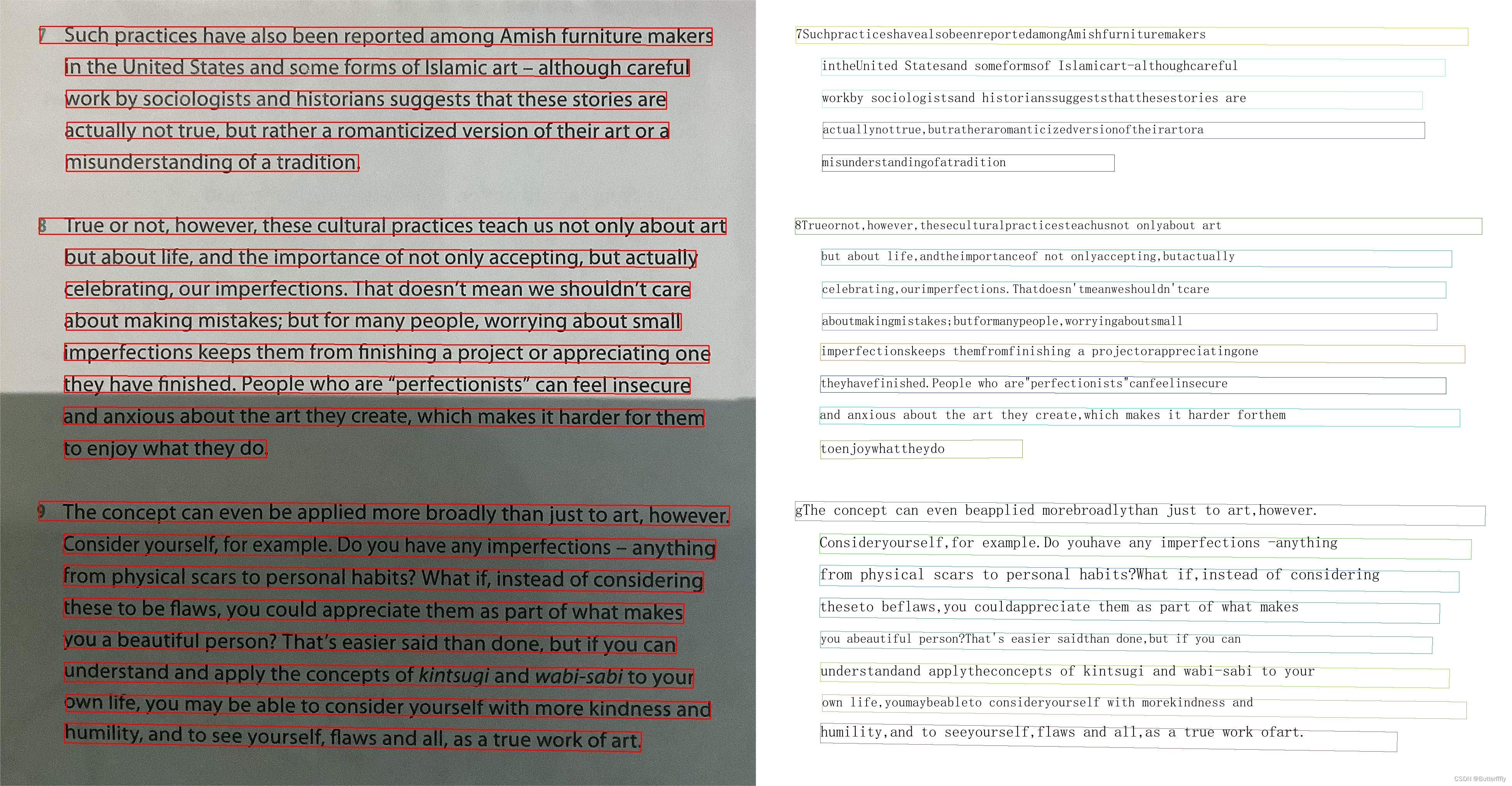 1)无阴影时,可以检测一整行为一个文本框;在阴影覆盖区域,一行文字会被识别为多个文本框。