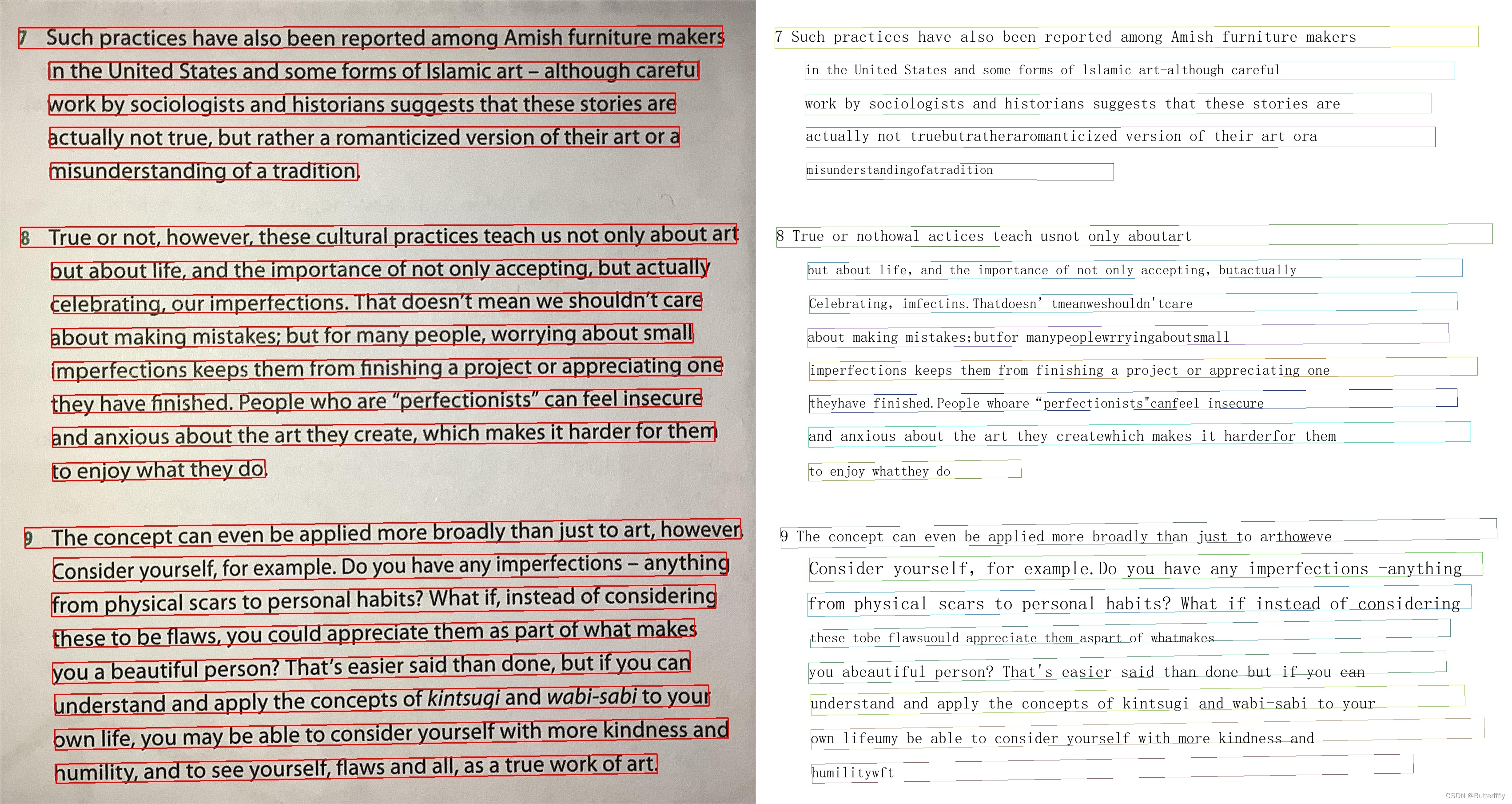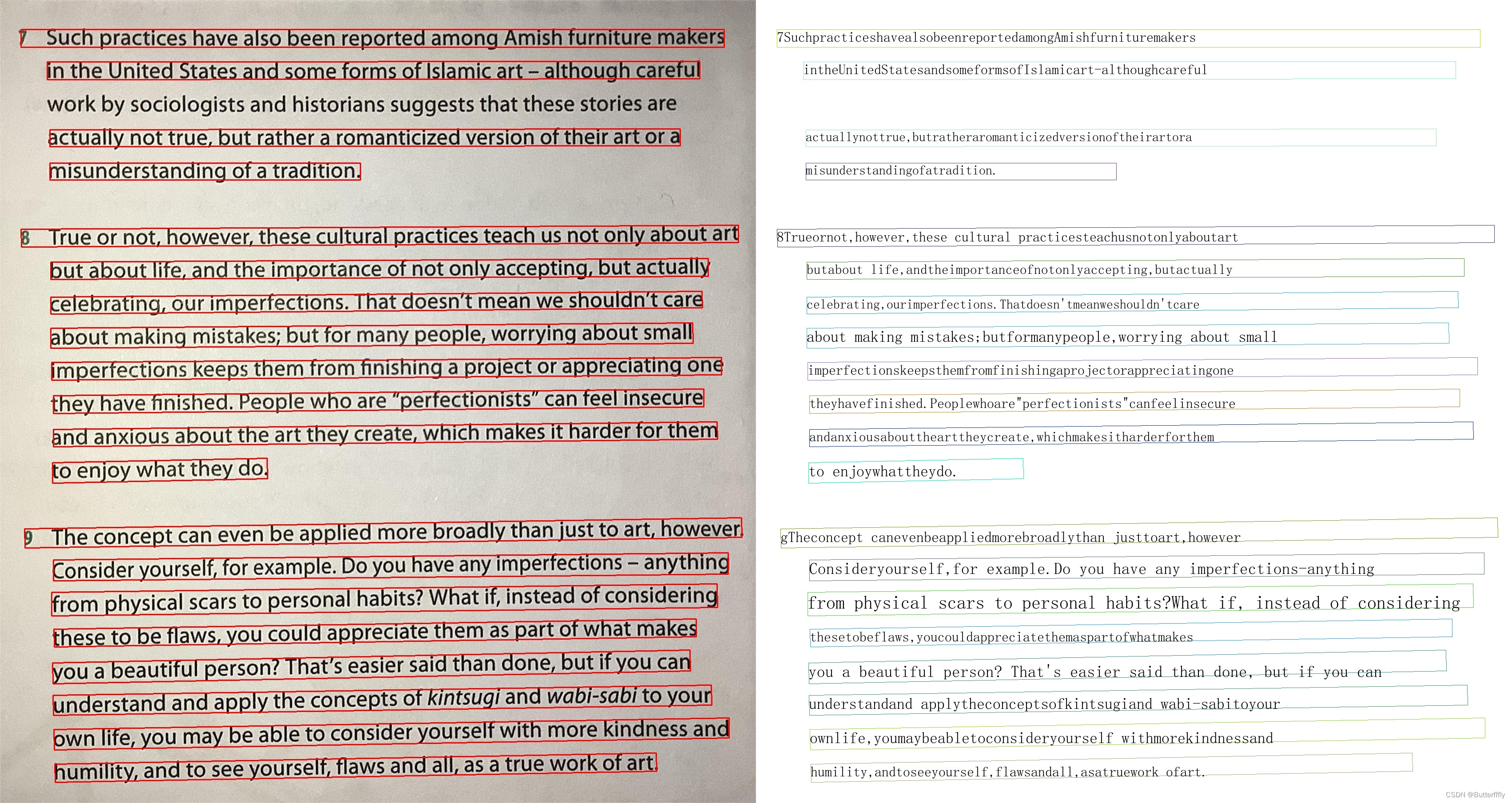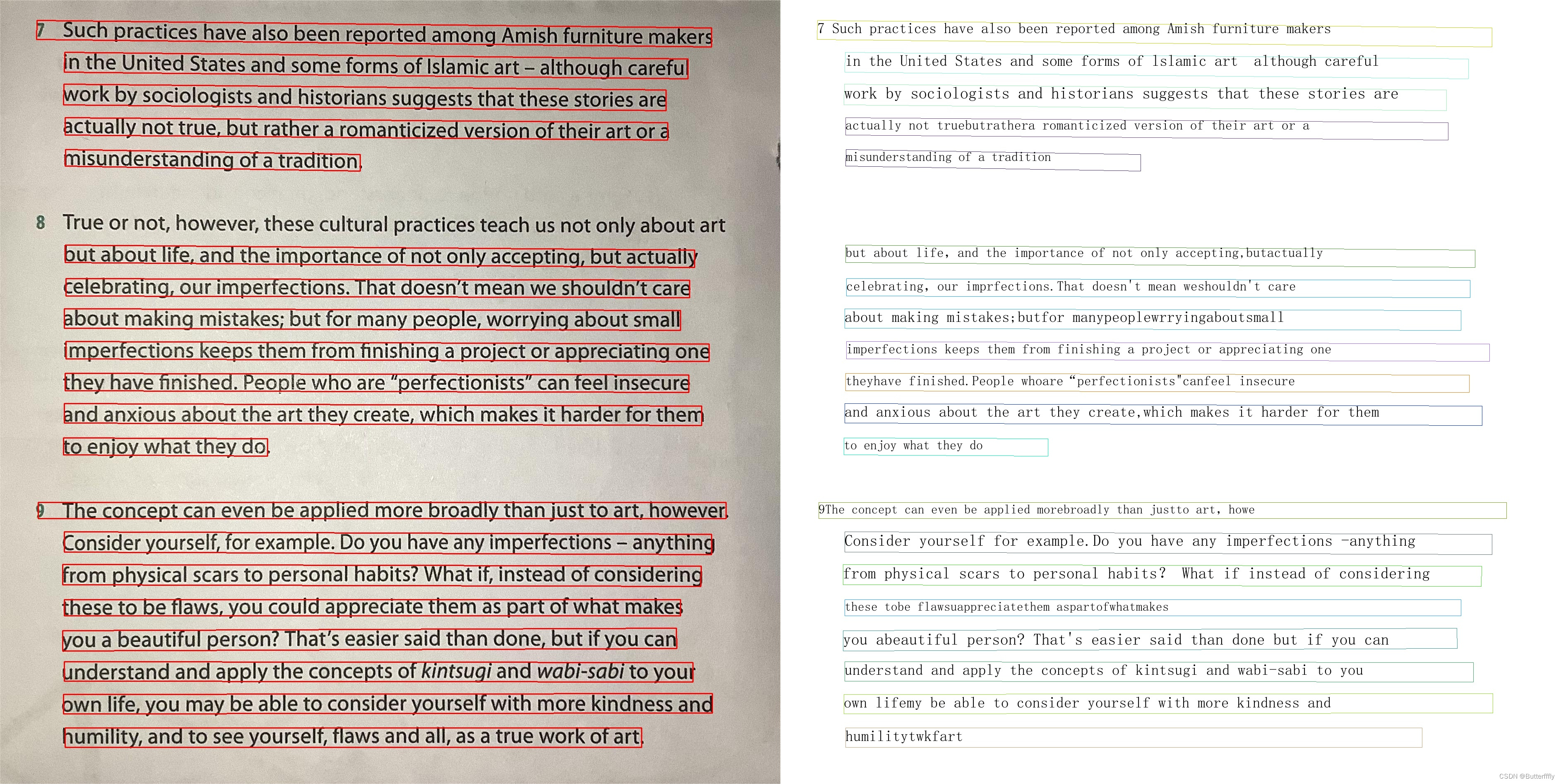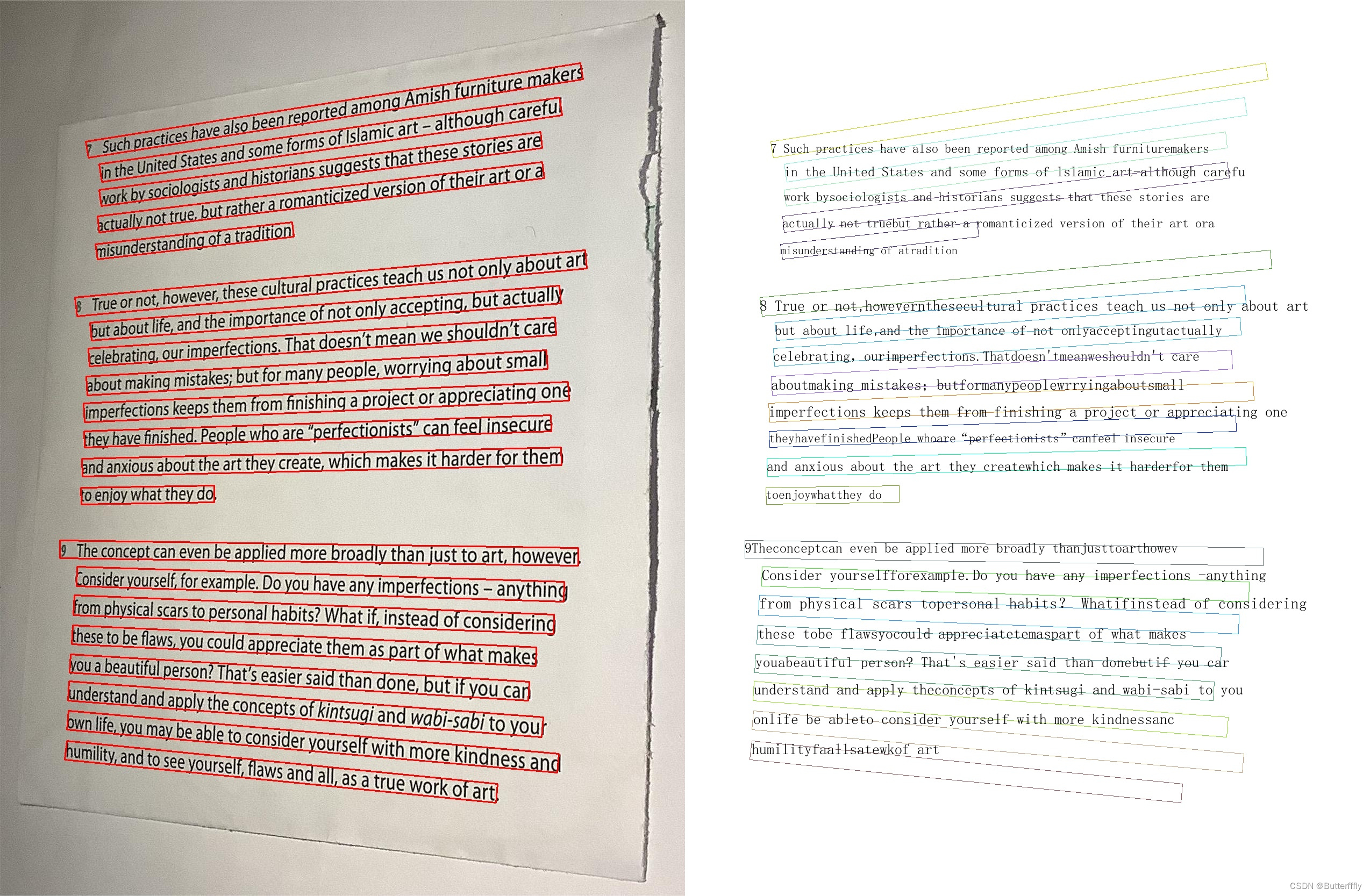 1)无阴影时,可以检测一整行为一个文本框;在阴影覆盖区域,一行文字会被识别为多个文本框。
