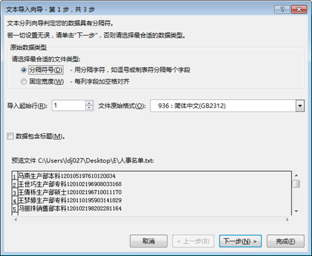 步骤4:对下列对话框中,对每列设置"列数据格式",其中包含×××号码的列设置为"文本"格式,单击"完成"。