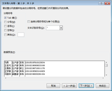 步骤3:分隔符号选择"Tab键",然后单击"下一步"。