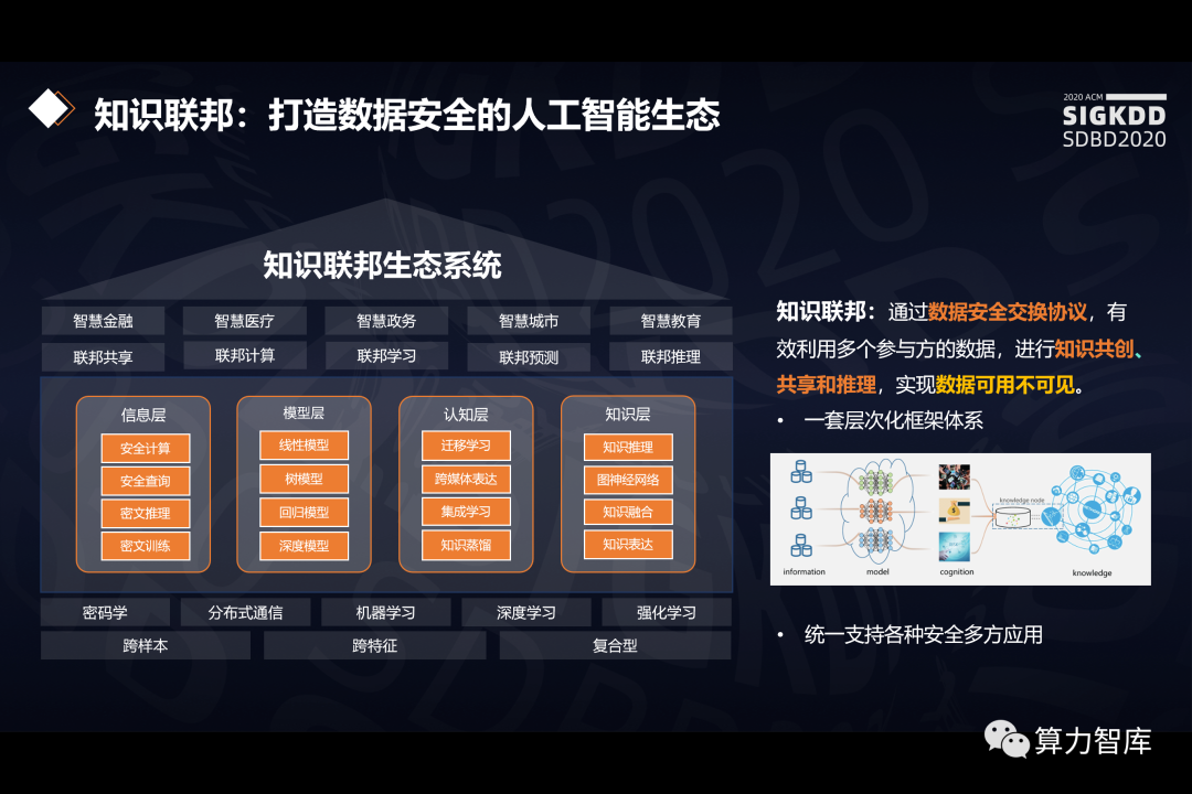 同盾科技合伙人兼人工智能研究院院长李晓林介绍了同盾科技的知识联邦,其利用一套层次化框架体系统一支持各种安全多方应用,通过数据安全交换协议,有效利用多个参与方的数据,进行知识共创、共享和推理,实现数据可用不可见。