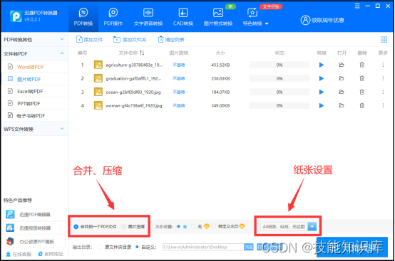 ② 图片添加进来我们可以在设置合并的文件以及纸张方面的参数。大家根据自己的需求来选择。