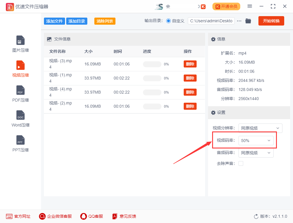 第三步 转换前在软件的右侧“视频码率”处进行压缩码率设置,用户根据需要进行设置,原则上视频码率值设置的越低视频压缩的越小,但是码率设置的过小会影响画质,所以适当就好。