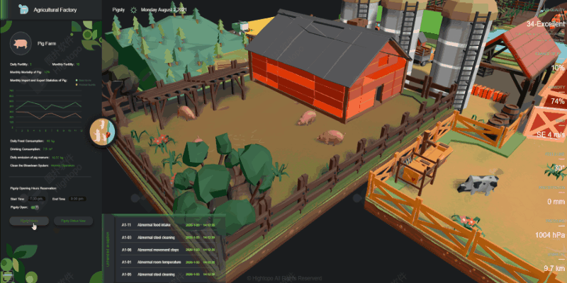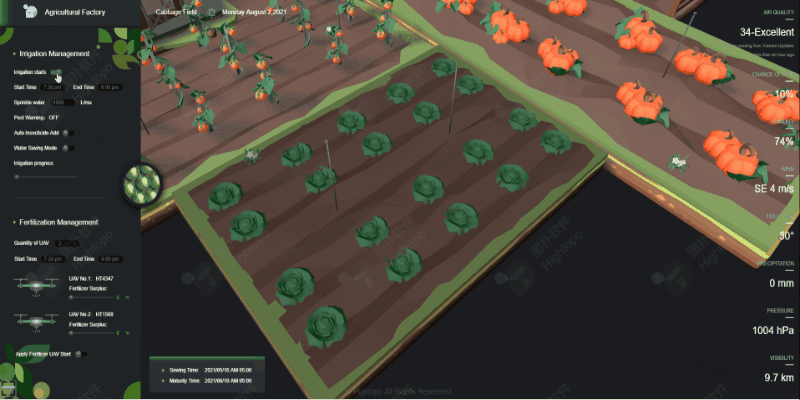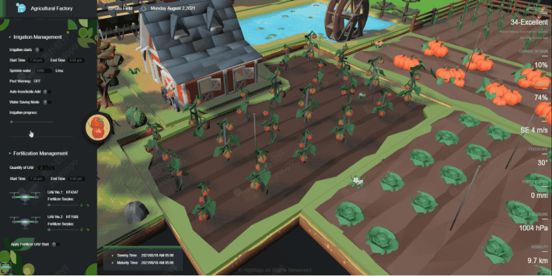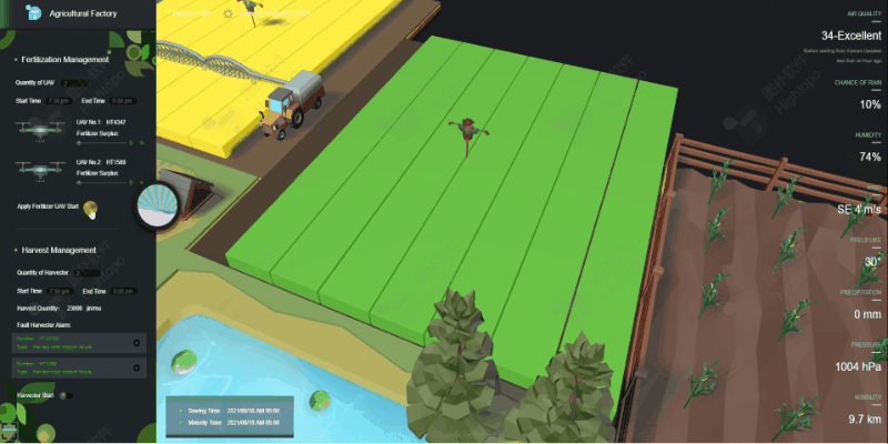 运用Hightopo自主研发的 HT 产品,全程零代码搭建 3D 轻量化 Low Poly 风格的智慧农场可视化解决方案,无缝融合 2D、3D 技术,1:1 还原农场的区域规划,展开对农作物间的网格化管理。业务囊括远程诊断、安全追溯、信息监测、安全预警等全方位需求。可实时感知现场的光、水、温、肥、热等实时生产环境、作业对象及设备状态,远程监测农业园区的生产过程、作业监督、生态环境,实现科学种植和安全生产。