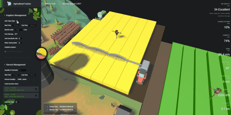 搭载北斗导航定位系统、5G 通信系统、机具状态检测传感技术,可对“无人收割机”、“无人拖拉机”、“无人采摘机”等多类型农机,进行高精准地理定位、路径自动规划、故障自动检测。结合 HT 引擎强大的渲染技术,精准复现农机在各地块的作业动态。远程操作农机的启停,根据事先规划好的路径,进行瓜果粮蔬自动采摘收割工程。设有车辆抓拍、移动侦测、入侵报警等智能分析功能,对作业现场、农机轨迹动态监控预警。2D 面板图表则呈现各农机的运行参数、收割数据详情、历史数据曲线对比等信息。