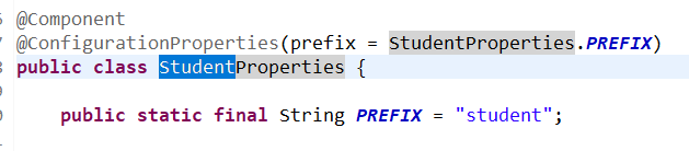 通常,我们会为 @ConfigurationProperties 添加 一个 prefix 属性,这个属性最好与类名的Xxx保持一致: