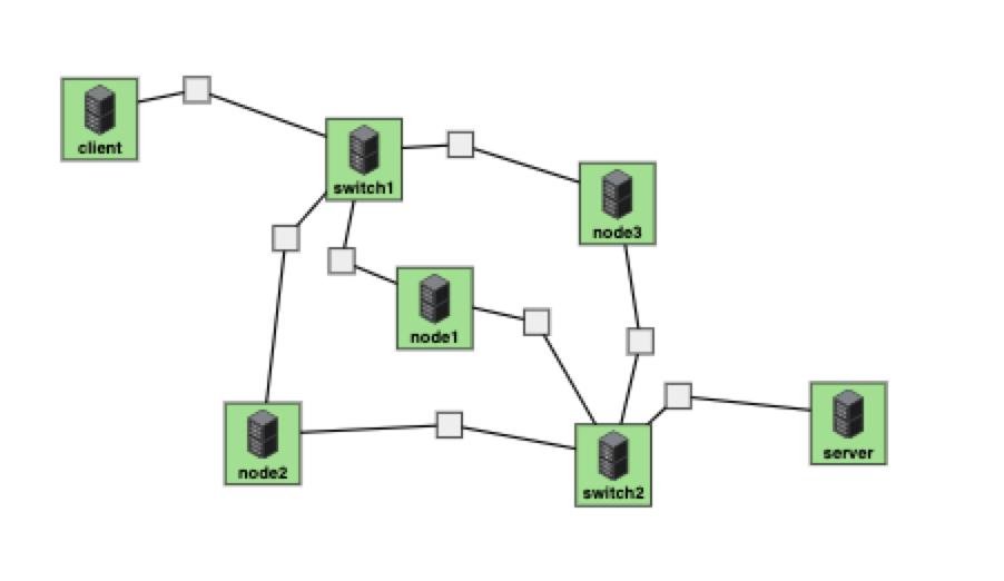 实验目的是让不同的tcp视频流通过switch1和switch2时被分流到不同的路径上(via node1/node2/node3)