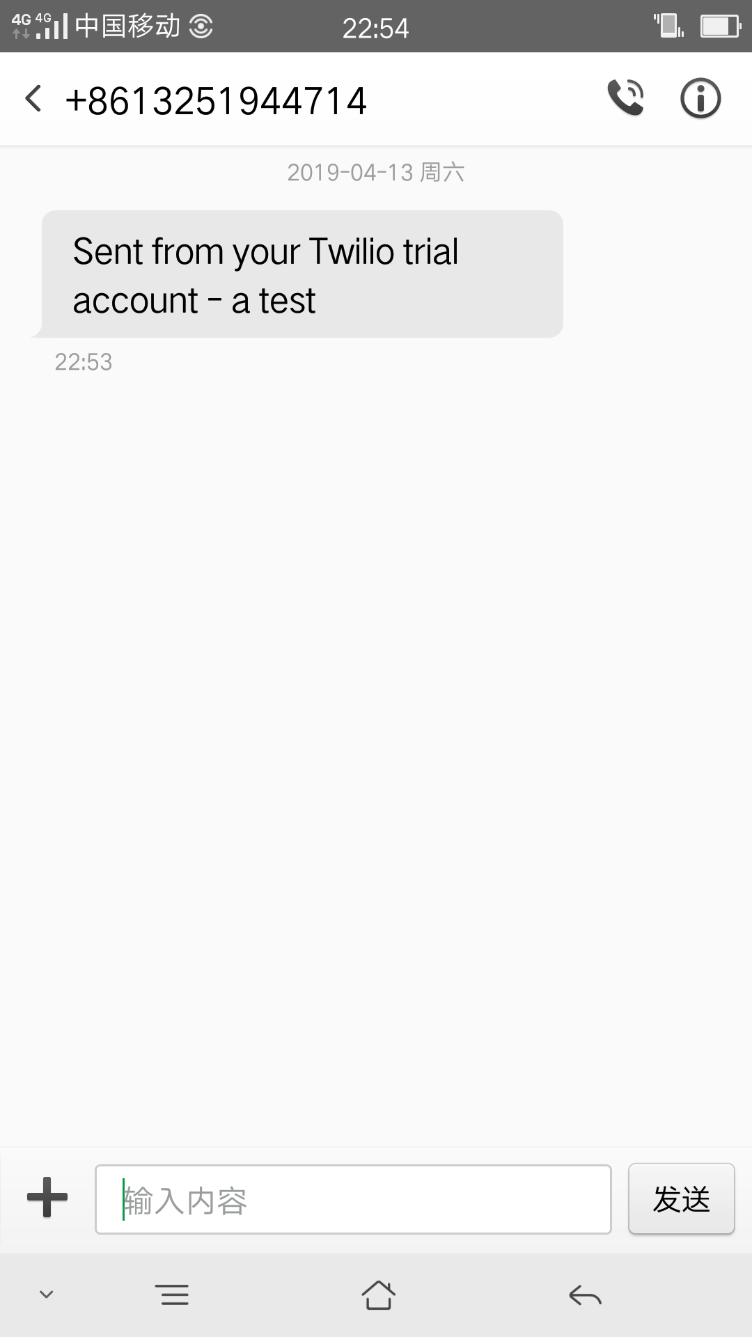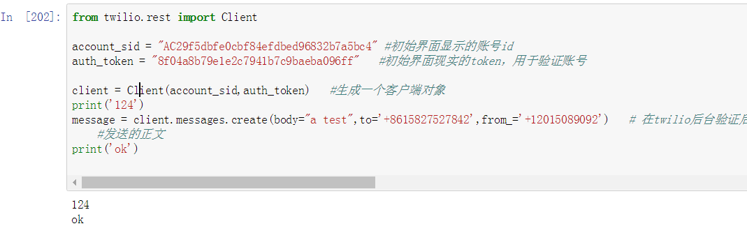 message = client.messages.create(body="a test",to='+86 **',from_='+12**092') # 在twilio后台验证后的手机号,一般为 ‘+86‘+手机号 from_ = '+122222222222', # 一开始申请的发送用手机号,