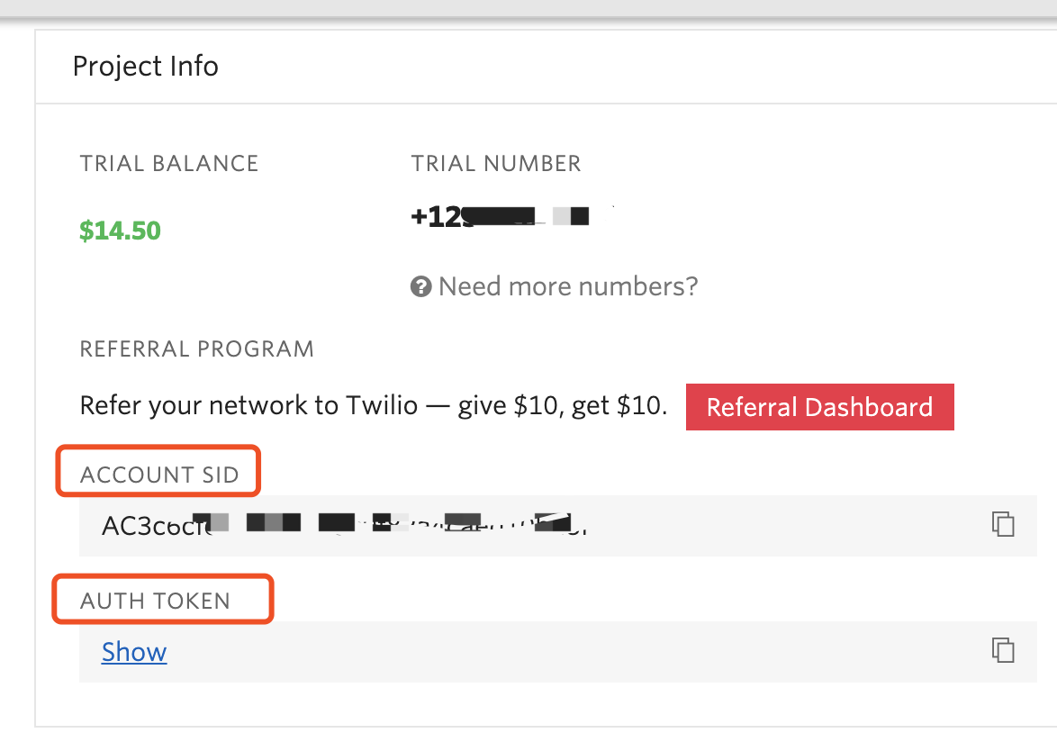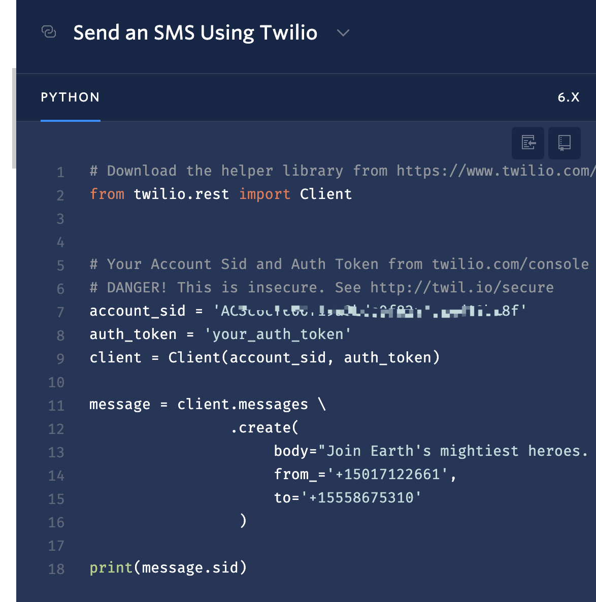 我们直接拿来用即可,把代码中 accountsid 和 authtoken 替换成自己的,这个两个值在刚才显示号码那个页面。