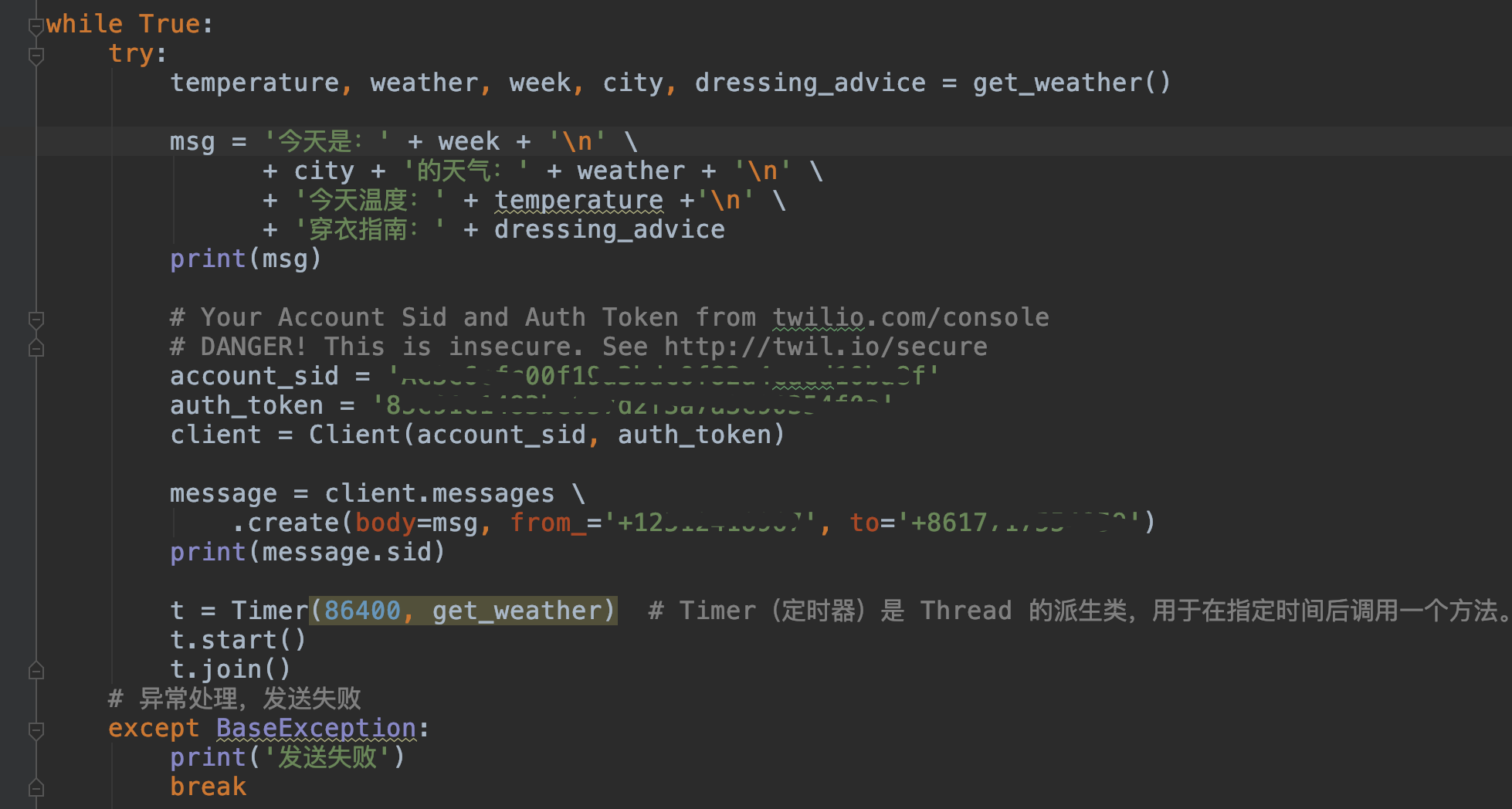 把刚才发送短信的内容替换成天气接口返回的信息 msg,定时操作的代码和之前一样。