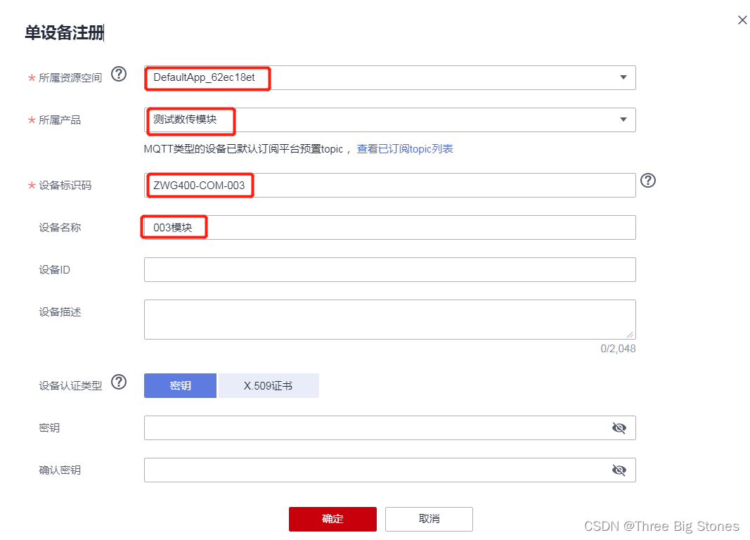 在华为IOT平台设备接入模块,注册一个设备,填写下图所示信息,