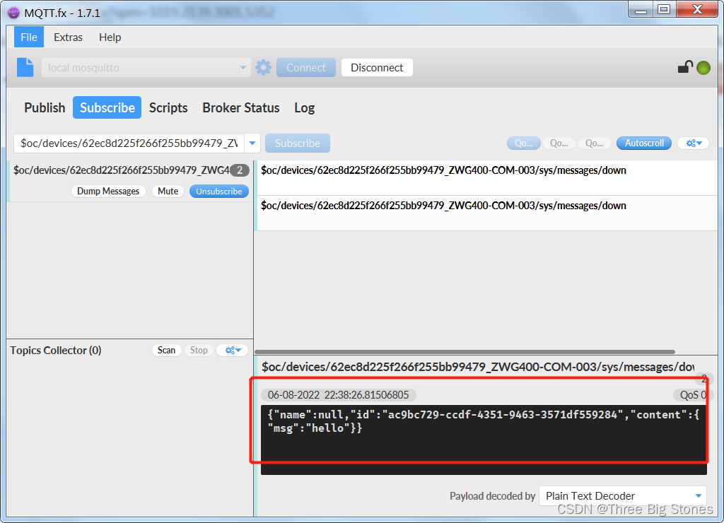 订阅一个主题:$oc/devices/62ec8d225f266f255bb99479_ZWG400-COM-003/sys/messages/down