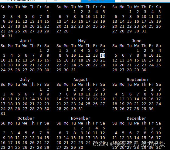 -3 显示系统前一个月,当前月,下一个月的月历 -j 显示在当年中的第几天(一年日期按天算,从 1 月 1 号算起,默认显示当前月在一年中的天数) -y 显示当前年份的日历