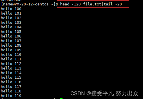 实例1: 有一个1000行的文件(上面有生成该文件的脚步程序),我们要取出这个文件的第100-120行的内容