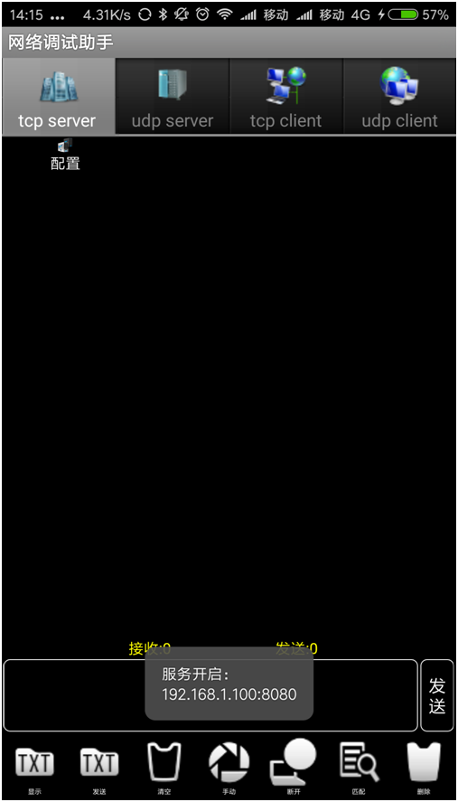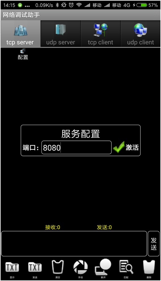 第四步:打开“有人网络助手”APP(版本不同可能略有差异),添加一个TCP SERVER,端口号要保持一致(检查设置)