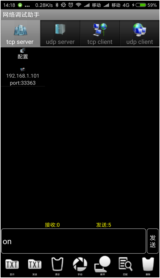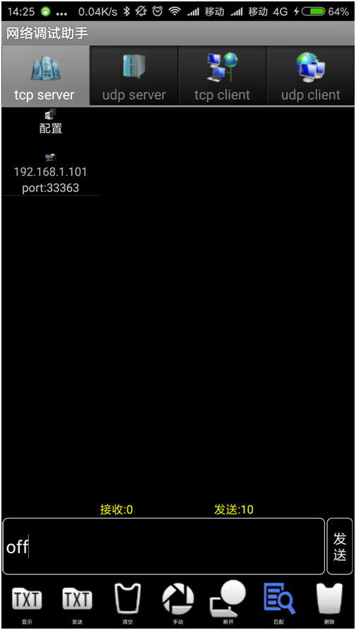 4、手机上的网络调试助手,发送框发送的为小写的”on”、“off”,反馈为大写的”ON”、”OFF”。