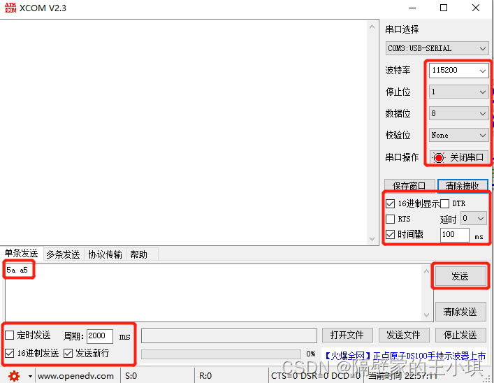 串口调试助手设置波特率设置115200,停止位1,数据为8,校验位None,以十六进制显示和发送。不勾选DTR和RTS。