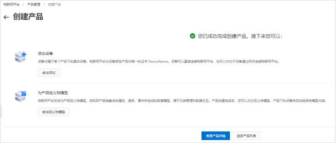 产品创建成功后,会出现如下页面,这里可以点击添加设备也可以点击为产品定义物模型(为产品定义属性、服务、事件)。下面步骤我们先添加设备。