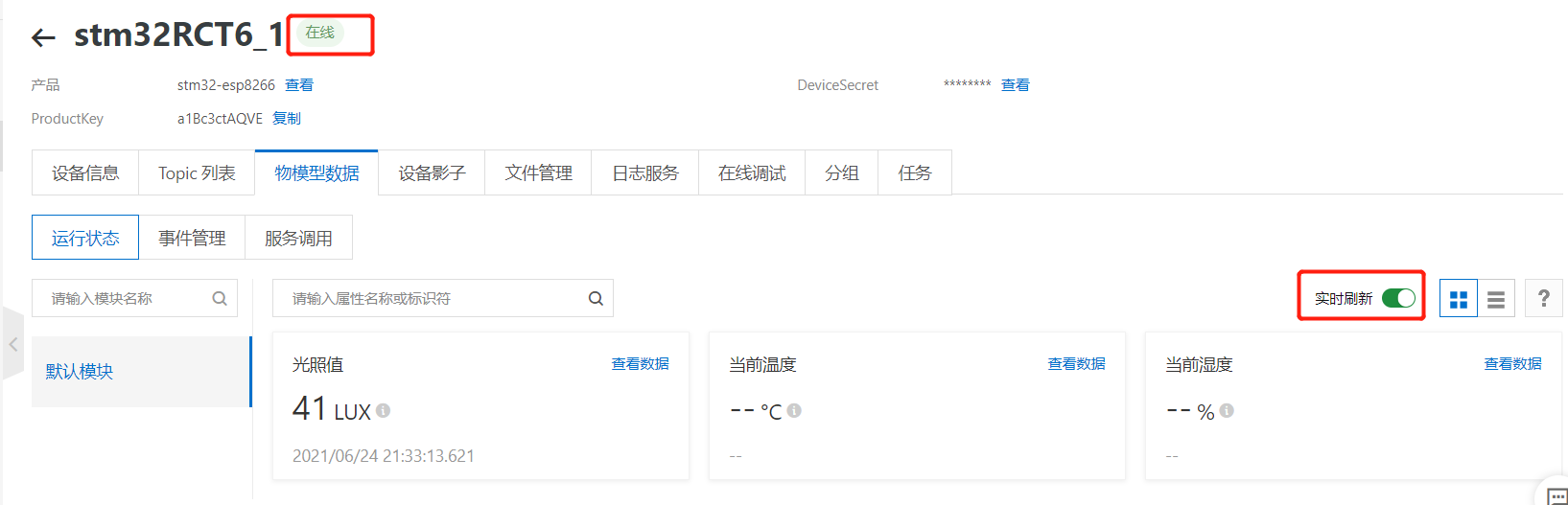 单击物模型数据 > 运行状态可查看设备的属性值,此时真实设备未接入,值均为空。
