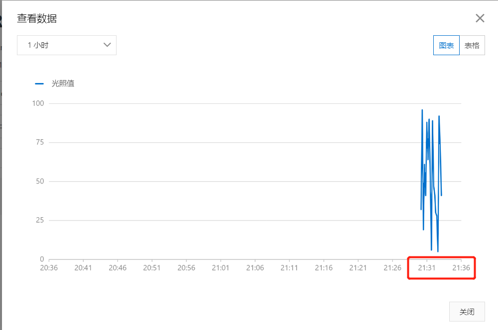 回到物联网平台,可以看到设备已经在线,并且得到光照值,点击查看数据,可以看到曲线的变换