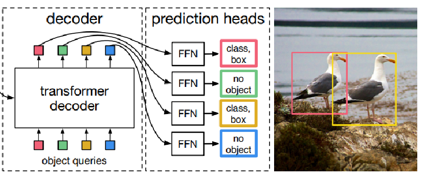 - decoder:对输入的100个向量(object queries)根据ecoder提取到的特征进行重构,object queries是核心,让它学会怎么从ecoder提取到的原始特征找到是物体的位置