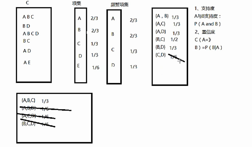 支持度:A与B的支持度Support(A->B)表示为P(A and B)。支持度揭示了A与B同时出现的概率。如果A与B同时出现的概率小,说明A与B的关系不大;如果A与B同时出现的非常频繁,则说明A与B总是相关的。