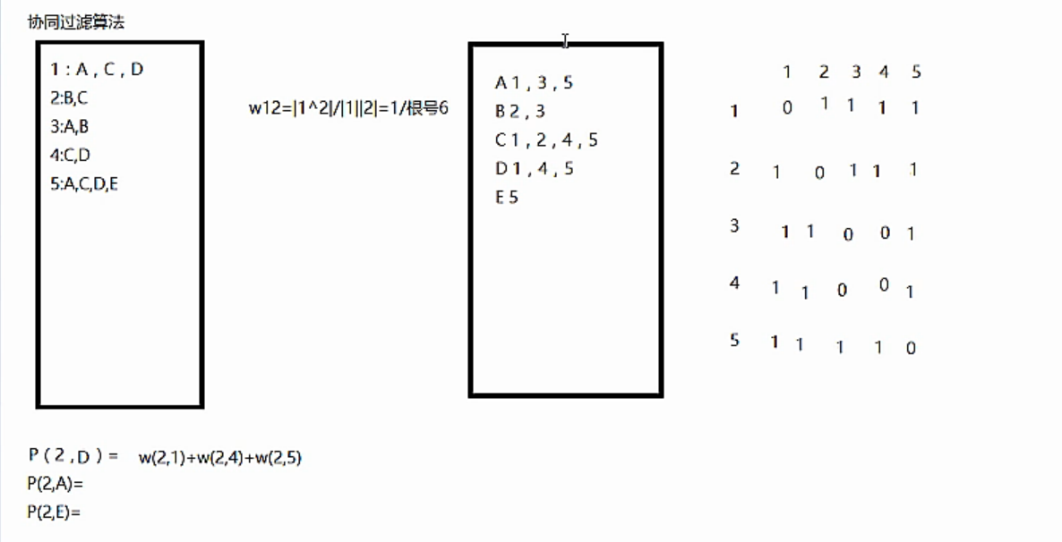 协同过滤算法是将每个点转换为概率的形式,根据倒排表,得到矩阵,计算出同一用户对不同物品感兴趣的概率之后,可以将相似品味的用户喜欢的物品推荐给该用户。比如,上面计算对于用户2,分别对A,D,E感兴趣的概率,然后取最大的推荐给该用户。其中每一个物品的计算方法是求得对该物品感兴趣的用户与用户2之间的相似度,比如,计算用户2对D物品感兴趣的概率,则计算用户2与对D感兴趣的用户1,4,5之间的相似度w之和,其中w的计算方法为余弦公式的计算,w(2,1) = |用户1和用户2的交集|/|用户1|×|用户2|.其中|.|为求模。