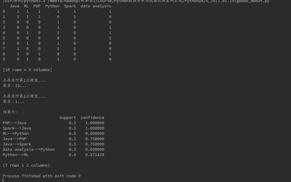 主要为连接函数和寻找关联规则的函数,其中需要定义support和confidence的值,需要折中选择这两个值,保证得到满意的结果。