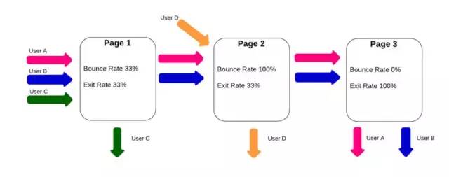 page2 有3个用户进来,1个出去,且page2作为着陆页仅有d用户,所以跳出率为1/1=100%,退出率为1/3=33%,跳出率就是100%,退出率是33%,跳出率是看着陆页的。