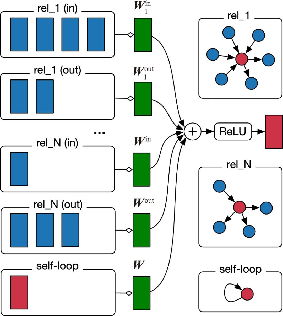 是一个用来正则化的系数。下图展示了关系图卷积网络的节点更新过程,对于每个节点