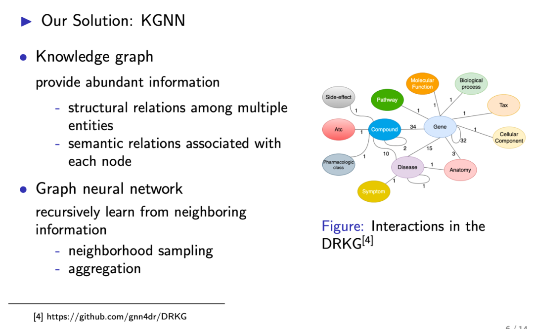 通过以上分析可以发现,这些方法的初衷是希望获得更多生物关联的信息。如果一个图或数据能够提供更多信息,那么就能有效辅助DDI预测,此时知识图谱就成为了一个上佳的选择。因为知识图谱蕴含了丰富的信息,包括多个实体之间的结构关系、与每个节点关联的语义关系等。在对过去DDI预测方法的梳理中,我们也找到了基于知识图谱的方法,但这个方法是采用知识图谱嵌入的方式,直接学习节点的嵌入表示,没有考虑每个实体丰富的邻域信息。为突破局限,林轩等人在知识图谱中引入图神经网络,借用图神经网络对每个节点进行邻域采样,通过聚合邻域信息获得实体的嵌入表示,这也就是基于知识图谱的图神经网络的动机来源。