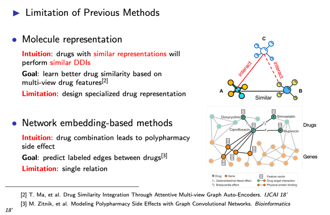 药物间的相互作用(DDI)是指同时或先后服用两种或两种以上药物时,药物之间所产生的相互作用,而该相互作用可能会导致意想不到的副作用。举个例子,在日常生活中,某人因睡眠不佳,服用了助眠药物,比如镇定剂。与此同时他又出现了过敏反应,需要服用治疗过敏的药物,比如抗组胺药。当两种药物混合服用,就可能会减缓大脑的反应。如果此人是从事车辆驾驶或者机械操作等需要注意力高度集中的工作,那么一旦出现紧急情况,就可能因无法及时做出反应,发生难以预料的危险。因此,如果能够提前预测DDI,就能有效避免类似情况的发生。