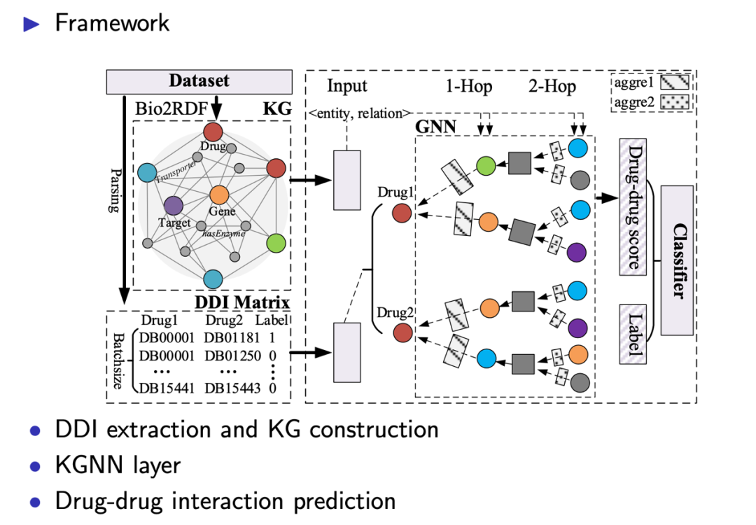 图4是基于知识图谱的图神经网络的整体框架,共包括三个模块:(1)DDI提取与KG构建;(2)KGNN层;(3)药物与药物相互作用预测。