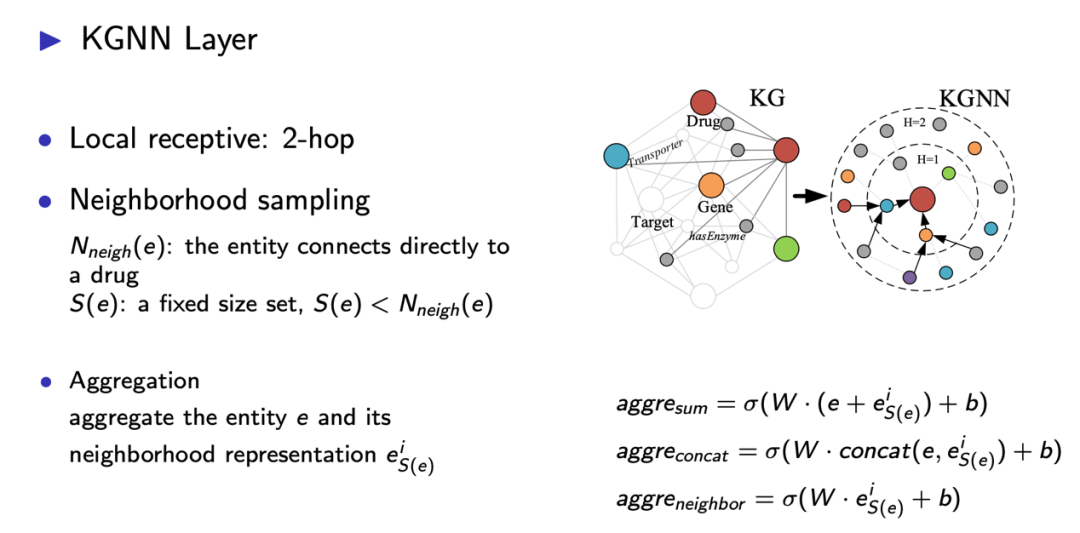 获得输入以后,需要对实体的邻域进行采样。每一个药物实体的邻域分布情况是不一样的,图6中红色的节点表示药物节点,考虑每个药物节点两跳的邻域范围。H参数可以理解为CNN中的感知域,H=1相当于只考虑与当前节点直接相连的邻居节点,H=2表示考虑二阶相连的节点情况,这样能够学习到更多的邻域实体信息,当然H可以取更大值。在这个框架中GNN是一种空间域的方法。在构建的知识图谱中,把和药物节点直接相连的节点定义为Nneigh(e)。因为每个药物节点邻域的分布是不同的,为了计算方便,借鉴GraphSAGE方法,采用固定大小的邻域范围S(e)。采样完成之后,通过三种聚合方法将实体自身的嵌入表示和邻域信息的嵌入表示聚合起来,最终得到当前实体的嵌入表示。其中,sum聚合方法是一种叠加操作,concat是一种拼接操作,neighbor只考虑邻域的信息,而忽略自身实体嵌入表示。